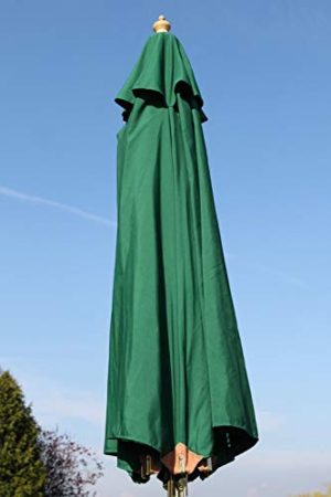 Hardwood pole (48mm) and 8 hardwood ribs from sustainable forests with a polished finish. 180g/m² polyester canopy treated with a water-repellent finish and a top wind vent. Leather patches and L-clips at rib attachment points. Rust-resistant brass-coloured bright steel fittings. Pulley lift mechanism.