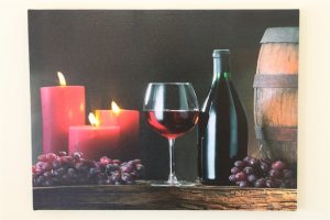 One Christmas canvas picture print featuring a wine barrel, wine bottle and candles, set on a wooden frame, with integrated LED lights and an on/off switch. Product reference: LED HD1290. Requires 2 x AA batteries (not supplied).
