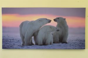 One large canvas picture print showing three polar bears, supplied as a single stretched canvas over a wooden frame.
