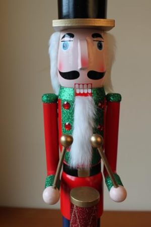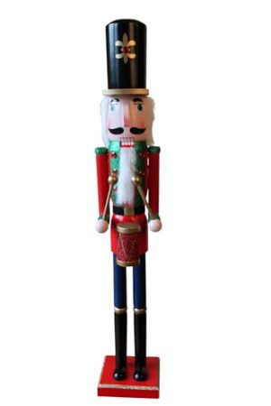 Decorative nutcracker figure in a traditional style, finished with a red coat and black hat. Intended for indoor decorative use.