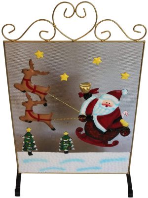 Steel fire guard with festive Santa and reindeer design and decorative scroll top. Free-standing construction with two metal feet that attach to the base.