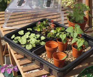 This set includes one heated propagator base and clear vented lid, plus a starter kit containing 1 large seed tray, 2 small seed trays and 10 flower pots.