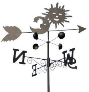 This product includes one sun and moon weathervane with spinning wind speed indicator cups, plus fittings for fixing to a vertical surface and a ground spike for lawn installation. It is supplied packaged in a picture box.