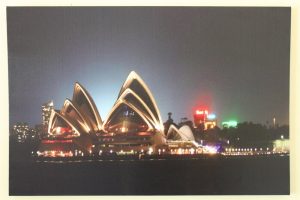 One canvas print featuring the Sydney Opera House, stretched over a wooden frame, with 8 integrated LED lights and an on/off switch. Requires 2 x AA batteries (not supplied).