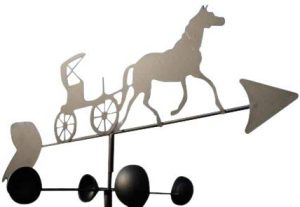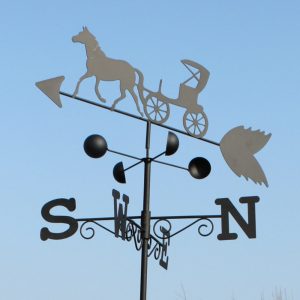 This product includes one horse and cart weathervane, fittings for mounting to a vertical surface, one ground spike for lawn installation, and a wall plate. The weathervane is supplied with parts for simple assembly.