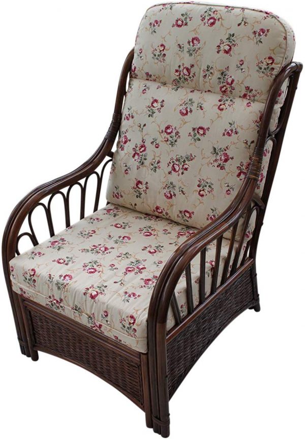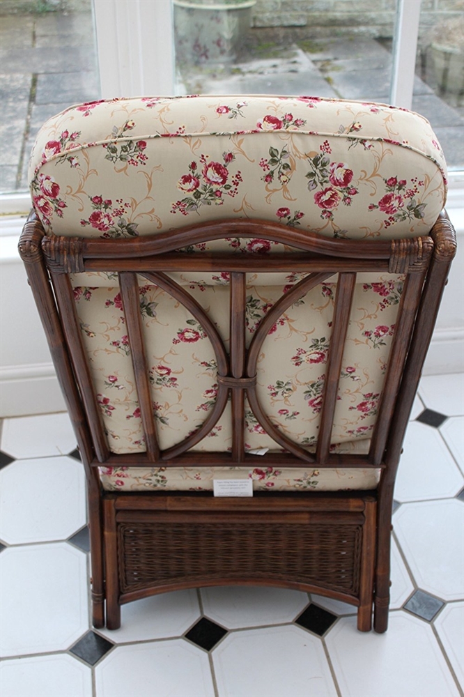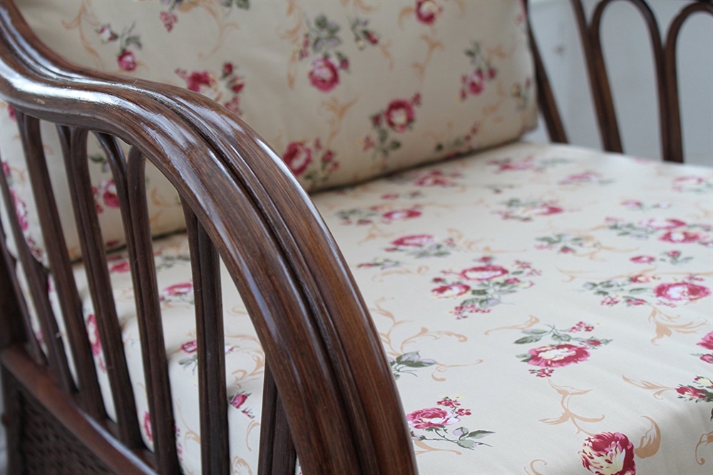 - Varnished mahogany colour cane, rose design fabric, the cushions comply with UK fire regulations